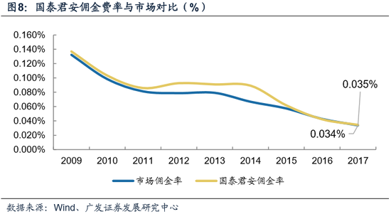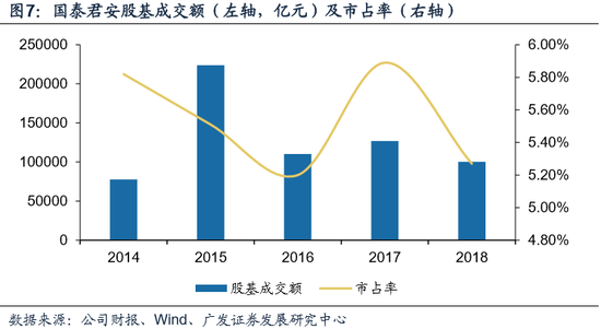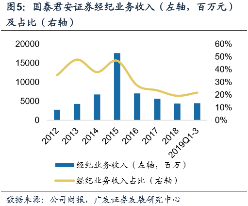 國泰君安的經(jīng)紀(jì)業(yè)務(wù)市占率位居行業(yè)第二,但經(jīng)紀(jì)業(yè)務(wù)手續(xù)費(fèi)收入位居行業(yè)第一。根據(jù)證券業(yè)協(xié)會披露,2018年國泰君安代理買賣證券收入(含席位租賃)排名行業(yè)第1,托管證券市值排名第5,股基成交額合計市占率約為5.89%,排名行業(yè)第2。