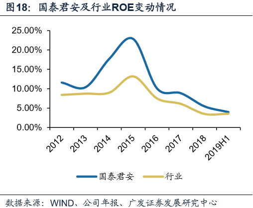 2016年以來,證券行業(yè)整體處于場內(nèi)資金縮水、交投活躍度下行的弱市環(huán)境,行業(yè)整體收益水平及盈利能力持續(xù)下滑,2016-2018年,證券行業(yè)凈利潤同比分別下滑49.6%、8.5%、41.0%,同期公司凈利潤表現(xiàn)較好,2019H1,市場回暖后行業(yè)凈利潤同比增長62.53%,公司凈利潤同比增長26.56%,業(yè)績表現(xiàn)更為穩(wěn)定。2016-19H1,行業(yè)平均凈資產(chǎn)收益率分別為7.5%、6.1%、3.5%、3.6%,期間公司表現(xiàn)顯著優(yōu)于行業(yè),公司ROE分別為10.1%、8.9%、5.4%、4.0%。