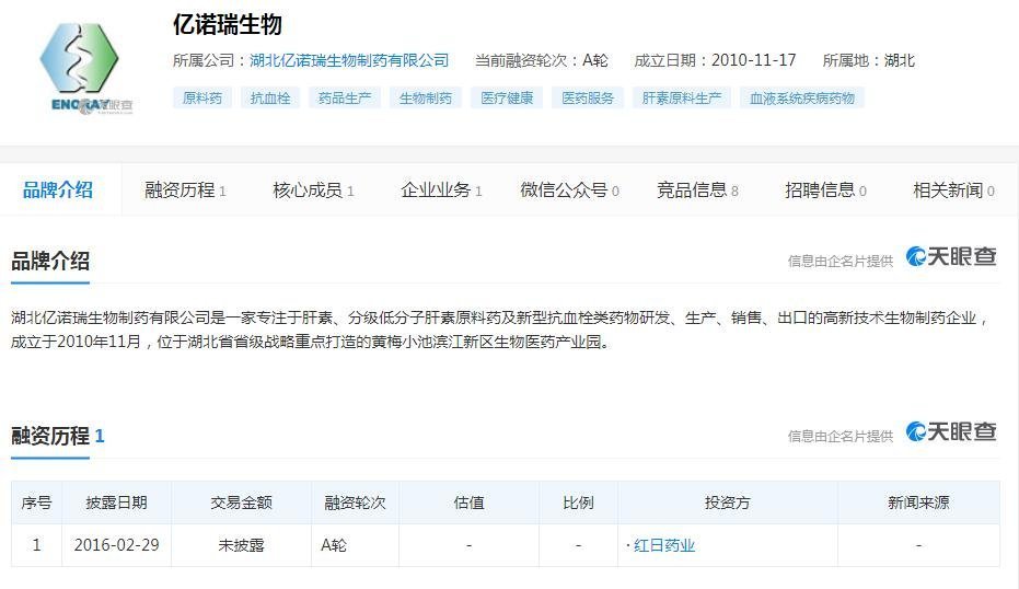 天眼查數(shù)據(jù)顯示,湖北億諾瑞生物制藥有限公司是一家專(zhuān)注于肝素、分級(jí)低分子肝素原料藥及新型抗血栓類(lèi)藥物研發(fā)、生產(chǎn)、銷(xiāo)售、出口的高新技術(shù)生物制藥企業(yè),成立于2010年11月,位于湖北省省級(jí)戰(zhàn)略重點(diǎn)打造的黃梅小池濱江新區(qū)生物醫(yī)藥產(chǎn)業(yè)園。紅日藥業(yè)于2016年2月披露參與公司的A輪融資。紅日藥業(yè)股票情況如下: