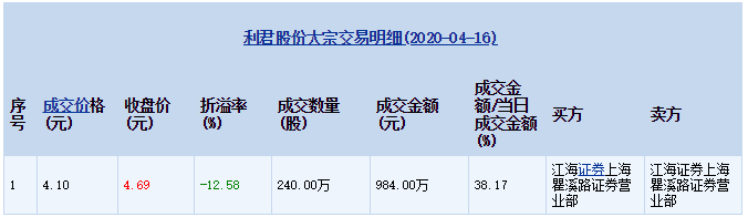 利君股份04月16日發(fā)生1筆大宗交易價(jià)格4.10元 折價(jià)12.58%