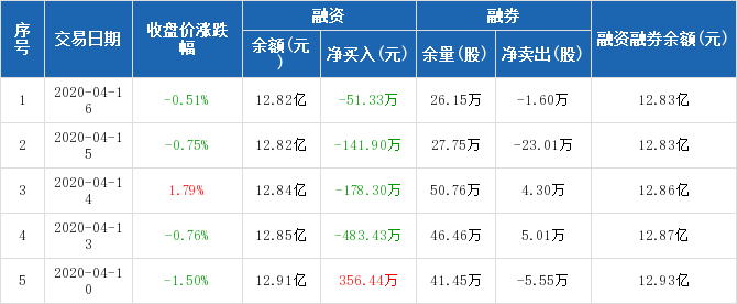 融資方面,當(dāng)日融資買(mǎi)入1630.69萬(wàn)元,融資償還1682.02萬(wàn)元,融資凈償還51.33萬(wàn)元,連續(xù)4日凈償還累計(jì)854.96萬(wàn)元。融券方面,融券賣(mài)出4000股,融券償還2萬(wàn)股,融券余量26.15萬(wàn)股,融券余額102.77萬(wàn)元。融資融券余額合計(jì)12.83億元。