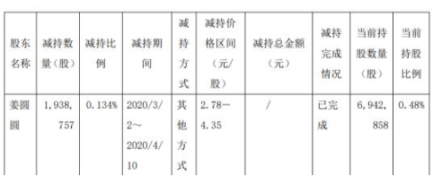 公告顯示,本次減持價(jià)格區(qū)間為2.78-4.35元/股,本次減持套現(xiàn)約843.36萬元。