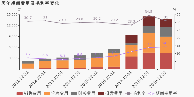 公司2019年營業(yè)成本6.6億,同比下降3.5%,低于營業(yè)收入8.5%的下降速度,毛利率下降3.5%。期間費用率為14.3%,同去年相比變化不大。經(jīng)營性現(xiàn)金流大幅下降52.1%至1.4億。公司本期研發(fā)投入為3991.7萬,同比下降13.9%。研發(fā)投入全部費用化,不作資本化處理。