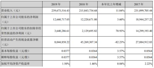 4月24日,【兆日科技(300333)、股吧】(300333)近日發(fā)布2019年年度報告,公告顯示,報告期內(nèi)實現(xiàn)營收239,673,516.43元,同比增長11.04%;歸屬于上市公司股東的凈利潤12,660,717.05元,同比增長3.60%;基本每股收益為0.0377元,上年同期為0.0364元。
