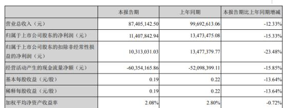 據(jù)了解,2020年第一季度,公司實現(xiàn)營業(yè)收入為8,740.51萬元,較去年同期減少12.33%;實現(xiàn)營業(yè)利潤1,476.21萬元,較去年同期減少3.80%;實現(xiàn)利潤總額1,475.21萬元,較去年同期減少3.85%;實現(xiàn)歸屬于上市公司股東的凈利潤1,140.78萬元,較去年同期減少15.33%;歸屬于上市公司股東的扣除非經(jīng)常性損益的凈利潤1,031.30萬元,較去年同期減少23.48%。