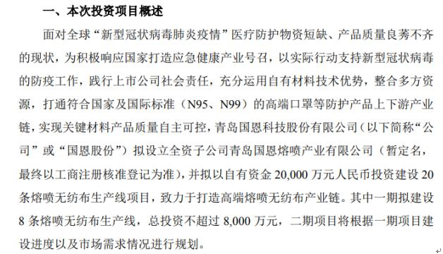 5月7日消息,國恩股份(002768)發(fā)公告稱,面對(duì)全球“新型冠狀病毒肺炎疫情”醫(yī)療防護(hù)物資短缺、產(chǎn)品質(zhì)量良莠不齊的現(xiàn)狀,為積極響應(yīng)國家打造應(yīng)急健康產(chǎn)業(yè)號(hào)召,以實(shí)際行動(dòng)支持新型冠狀病毒的防疫工作,踐行上市公司社會(huì)責(zé)任,充分運(yùn)用自有材料技術(shù)優(yōu)勢(shì),整合多方資源,打通符合國家及國際標(biāo)準(zhǔn)(N95、N99)的高端口罩等防護(hù)產(chǎn)品上下游產(chǎn)業(yè)鏈,實(shí)現(xiàn)關(guān)鍵材料產(chǎn)品質(zhì)量自主可控,青島國恩科技股份有限公司擬設(shè)立全資子公司青島國恩熔噴產(chǎn)業(yè)有限公司,并擬以自有資金20,000萬元人民幣投資建設(shè)20條熔噴無紡布生產(chǎn)線項(xiàng)目,致力于打造高端熔噴無紡布產(chǎn)業(yè)鏈。其中一期擬建設(shè)8條熔噴無紡布生產(chǎn)線,總投資不超過8,000萬元,二期項(xiàng)目將根據(jù)一期項(xiàng)目建設(shè)進(jìn)度以及市場需求情況進(jìn)行規(guī)劃。
