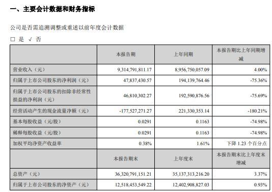 5月3日消息,錫業(yè)股份(000960)近日發(fā)布2020年第一季度報(bào)告,公告顯示,本報(bào)告期營(yíng)業(yè)收入9,314,791,811.17元,同比增長(zhǎng)4%;歸屬于上市公司股東的凈利潤(rùn)47,837,430.57元,同比減少75.36%;本報(bào)告期末總資產(chǎn)36,320,791,151.21元,較上年度末增長(zhǎng)3.37%;歸屬于上市公司股東的凈資產(chǎn)12,518,453,549.22元,較上年度末增長(zhǎng)0.93%。
