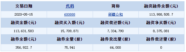 新疆眾和(600888)2020-05-15融資融券信息顯示,新疆眾和融資余額113,631,583元,融券余額356,922.7元,融資買入額15,709,871元,融資償還額7,334,790元,融資凈買額8,375,081元,融券余量75,941股,融券賣出量64,000股,融券償還量0股,融資融券余額113,988,505.7元。新疆眾和融資融券詳細(xì)信息如下表: