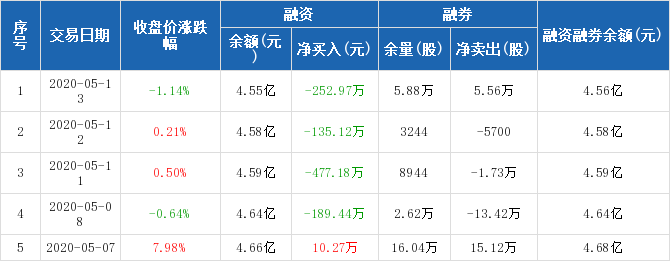 貴航股份融資融券信息顯示,2020年5月13日融資凈償還252.97萬元;融資余額4.55億元,較前一日下降0.55%。