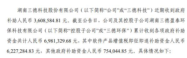 5月13日消息,【三德科技(300515)、股吧】(證券代碼:300515)發(fā)布公告稱,公司近期收到政府補助人民幣3,608,584.81元。截至公告日,公司及其控股子公司湖南三德盈泰環(huán)保科技有限公司累計收到各項政府補助資金共計人民幣6,981,329.68元,其中軟件產(chǎn)品增值稅即征即退補助資金人民幣6,227,284.83元,其他政府補助資金人民幣754,044.85元。