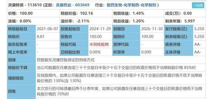 靈康藥業(yè)(603669)贖回價(jià)為100,最終稅前收益僅1.49%,債券收益率較低。醫(yī)藥屬于紅利行業(yè),未來(lái)發(fā)展不錯(cuò),綜合看不影響價(jià)格。
