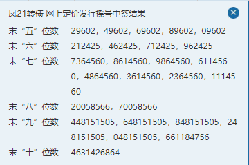 鳳21轉(zhuǎn)債中簽號(hào)出來(lái)之后,小編將在這里第一時(shí)間進(jìn)行更新,如果沒(méi)有更新,可聯(lián)系贏家財(cái)富網(wǎng)QQ100800360