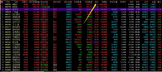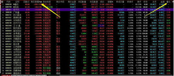 2、競(jìng)價(jià)結(jié)束后,選擇量比排行榜前30的,漲幅在5%-7&以上的;