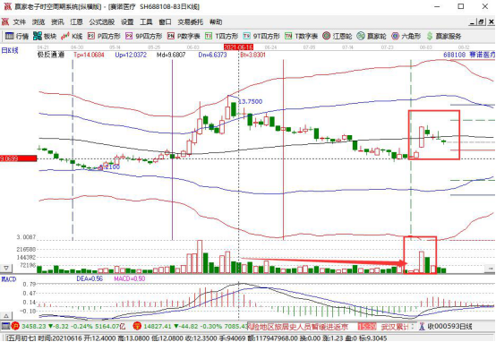 第四,個股達到漲停高位后回落,釋放天數,這往往是峰頂信號。一只股票已經經歷了連續(xù)漲停的主升浪,如果有一天只打漲停,但沒封馬上就會跌下來,而且當天的換手率特別高,成交的量特別大,那就要注意筑頂了。