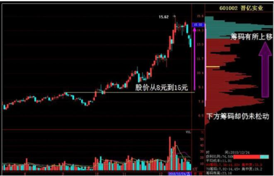 在股價大漲之后,我們會發(fā)現(xiàn)主力籌碼過渡到高位的效率非常高?;I碼大量向高價位區(qū)移動后,籌碼主峰出現(xiàn),在股價跌破籌碼的時候,形成主峰的過程中,可以很快就能找到賣點機會?;I碼主峰的出現(xiàn)就是主力逃跑的證據(jù)。當股價跌破籌碼峰值后,散戶持股成本價跌破是主要的籌碼,主要的籌碼說明拋售將主導(dǎo)股價下跌趨勢。