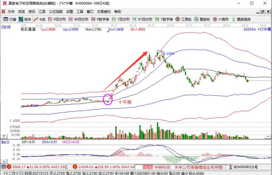 晨十字星和晨星是最底層的組合。一般先拉一根陰線在底部,再拉一根十字星線。十字星一詞一般在銀線收盤價附近,然后從十字星附近開出一條中陽線,形成經(jīng)典組合。