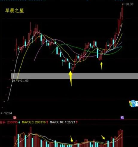 晨星又稱啟明星,是k線理論中重要的轉(zhuǎn)折形態(tài)之一。晨星的技術(shù)形態(tài)也是一根帶有長影線的k線。但它的位置主要出現(xiàn)在一只股票的底部,這是一個非常明顯的觸底信號。晨星和射擊之星的位置結(jié)構(gòu)正好相反。它的結(jié)構(gòu)在底部,當主力在股票底部打開一個位置時,該股就會上漲。然而為了不留下市場印記,聰明的主力會在收盤前故意將該股的股價壓到原來的位置。此時,該股將呈現(xiàn)底部有長影的k線。這條k線可以是陽線,也可以是陰線。