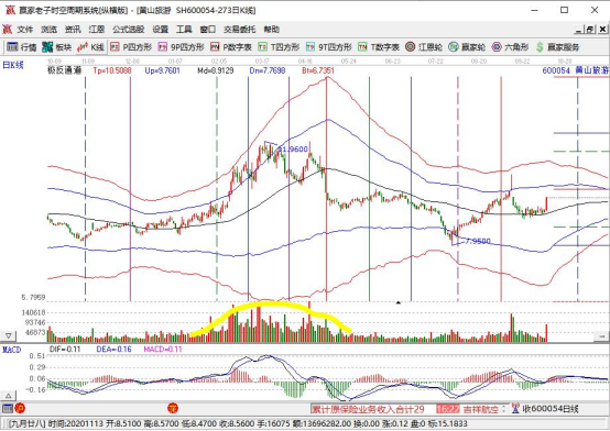 3.成交的數(shù)量形成圓弧頂,5日的量線傾向于10日穿越量線。