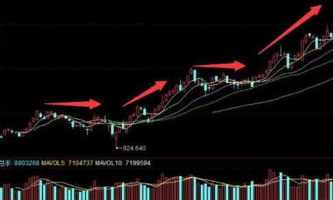 在拉升過程中,成交量會逐漸適度放大。而當(dāng)股價停止休息時,成交量會明顯減少。股價上漲階段,隨著成交量的放大,k線圖上會不時出現(xiàn)中陽線或大陽線,每次回落拉升的高點都會高于前一次上漲的高點。每個下降的低點高于前一個下降的低點。這說明股價整體重心在不斷向上移動,每次上漲的上升角度一般會保持30度以上的斜率。