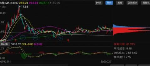 3.籌碼的分布顏色分為藍(lán)色和紫色或粉色三種。藍(lán)色表示“死籌”,即60個交易日未成交的籌碼。紫色表示“浮籌”,即60個交易日成交的籌碼。