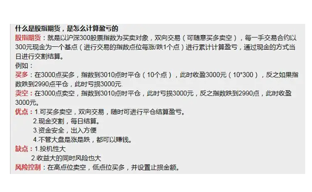 期貨股票指數(shù)也可以用作杠桿投資工具。由于股指期貨的保證金交易只要判斷方向正確,就有可能獲得高額回報。例如,如果保證金是10%,你買了一只滬深300指數(shù)期貨,只要股票指數(shù)的期貨上漲5%,你就可以獲利50%。當然,如果你判斷錯誤,期指不漲反而跌了5%,那么投資者就損失了50%的本金。