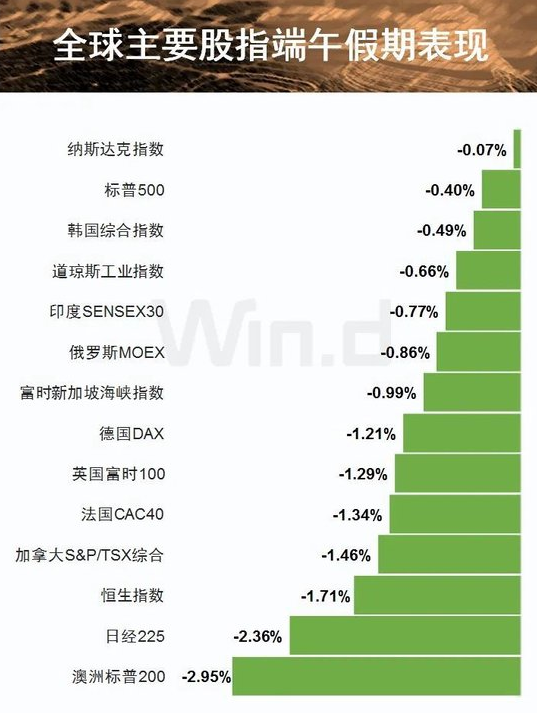端午假期,全球主要經(jīng)濟(jì)體14個股指,全部以下跌報收,其中美股三大股指因前期持續(xù)回探,周四有所反彈,周五再度下跌,因此端午期間累計(jì)跌幅不大都在1%以內(nèi),歐洲三大股指均下跌在1%~1.5%之間,而亞太市場跌幅較大,澳洲標(biāo)普200、日經(jīng)225指數(shù)下探在2%以上,下周市場或仍較弱。