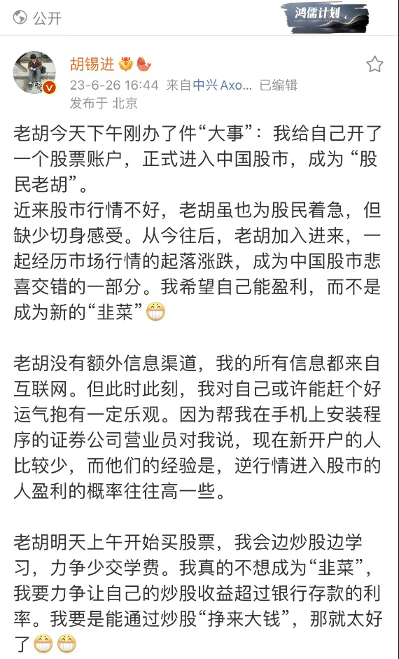 知名媒體人、《環(huán)球時(shí)報(bào)》前總編輯胡錫進(jìn)宣布進(jìn)軍股市。
