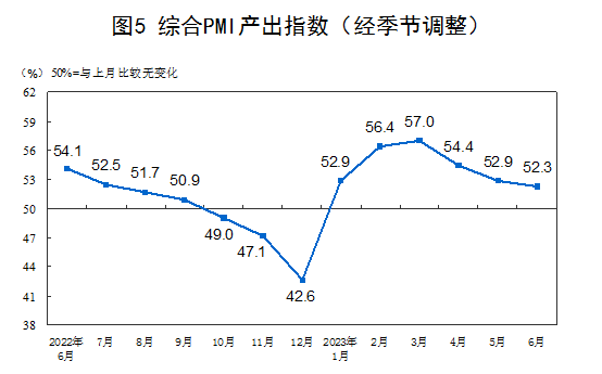 6月份,綜合PMI產(chǎn)出指數(shù)為52.3%,比上月下降0.6個(gè)百分點(diǎn),繼續(xù)位于擴(kuò)張區(qū)間,表明我國(guó)企業(yè)生產(chǎn)經(jīng)營(yíng)總體延續(xù)擴(kuò)張態(tài)勢(shì)。
