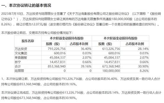 據(jù)公告顯示,2023年7月10日,萬達(dá)投資與陸麗麗簽署了《關(guān)于萬達(dá)電影股份有限公司之股份轉(zhuǎn)讓協(xié)議》,萬達(dá)投資擬向陸麗麗轉(zhuǎn)讓其持有的萬達(dá)電影無限售條件流通股1.8億股(占公司總股本的8.26%),轉(zhuǎn)讓價(jià)格為12.07元/股(該交易價(jià)格約為《股份轉(zhuǎn)讓協(xié)議》簽署日前一個(gè)交易日標(biāo)的股票收盤價(jià)的90%)。該項(xiàng)交易涉及金額21.73億元。