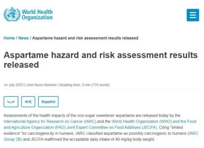 IARC引用了對(duì)人類致癌性的“有限證據(jù)”,將阿斯巴甜歸類為可能對(duì)人類致癌(IARC 2B組)一類,JECFA則重申,每日可接受的攝入量為40mg/kg體重。