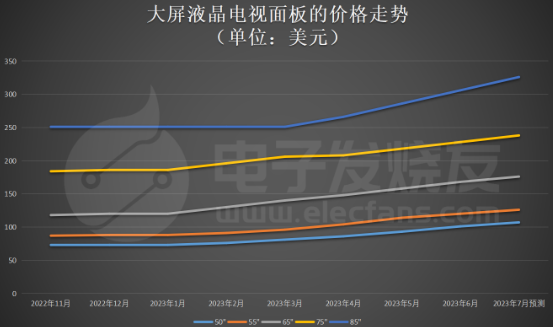 到7月份,大屏電視面板價(jià)格漲幅仍不會(huì)收斂。RUNTO預(yù)測(cè),2023年7月65寸及以上的尺寸的電視面板價(jià)格將保持持續(xù)上漲趨勢(shì),65寸有望進(jìn)一步突破176美元/片,85寸單價(jià)則攀升至326美元/片。