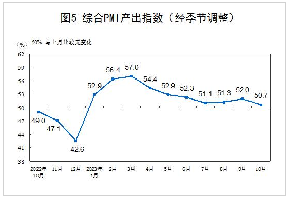 10月份,綜合PMI產(chǎn)出指數(shù)為50.7%,比上月下降1.3個(gè)百分點(diǎn),表明我國(guó)企業(yè)生產(chǎn)經(jīng)營(yíng)活動(dòng)總體擴(kuò)張,但擴(kuò)張速度放緩。