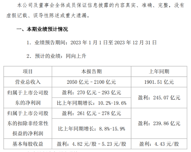 公告顯示,公司預(yù)計(jì)2023年凈利潤(rùn)270億元–293億元,同比增長(zhǎng)10.2%-19.6%;營(yíng)業(yè)總收入2050億元–2100億元,去年同期為1901.51億元。