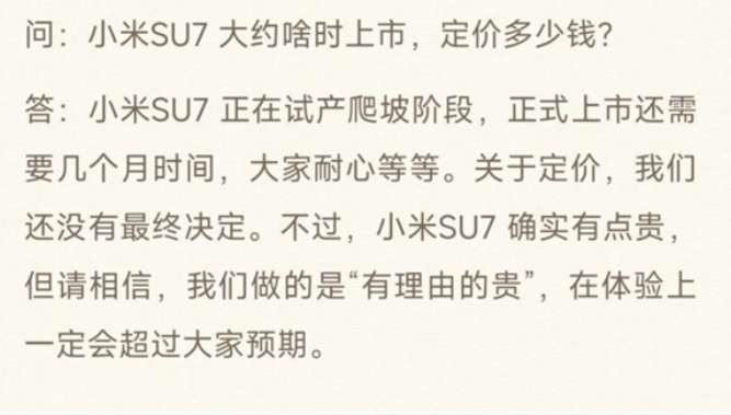 不過,小米SU7確實有點貴,但請相信,我們做的是“有理由的貴”,在體驗上一定會超過大家預(yù)期。