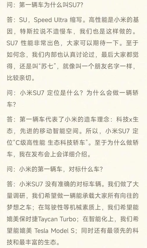 對于小米SU7的命名,雷軍解釋稱,SU,Speed Ultra(超級速度)縮寫;高性能是小米的基因,特斯拉說不造慢車,我們也是這樣做的。