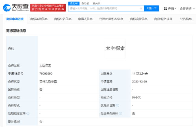 1月17日電,天眼查App顯示,近日,華為技術(shù)有限公司申請注冊“太空探索”“探索家”商標(biāo),國際分類為科學(xué)儀器、珠寶鐘表,當(dāng)前商標(biāo)狀態(tài)均為等待實質(zhì)審查。據(jù)悉,自Mate50系列開始,華為多款手機已實現(xiàn)“衛(wèi)星通信”。不久前,華為在ACP2023大會上發(fā)布了光通信系統(tǒng)架構(gòu)及技術(shù)演進報告,并提出“太空寬帶”計劃,該計劃有望在2030年正式落地。