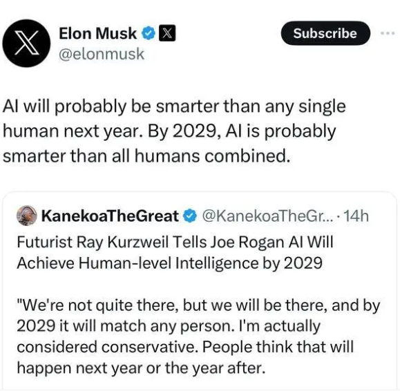 最近,特斯拉創(chuàng)始人馬斯克在社交媒體上再次發(fā)表了關(guān)于人工智能的“瘋狂”預測。他表示,明年人工智能可能會比任何人類個體都聰明,而到2029年,人工智能甚至可能比所有人類加起來還要聰明。這一評論引起了廣泛關(guān)注,尤其是在未來學家Ray Kurzweil的視頻節(jié)目后。