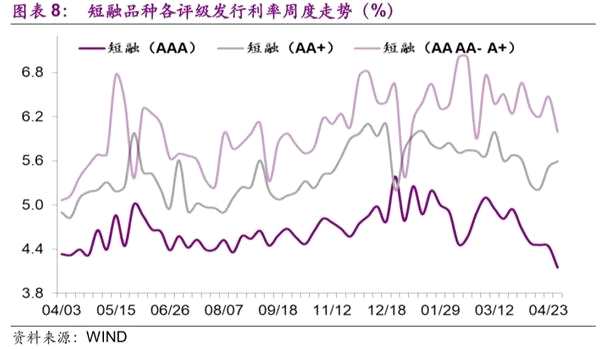 2.2.2 短融發(fā)行利率降低,高低評級品種利率分化