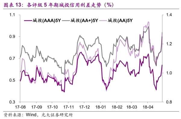 其中,產(chǎn)業(yè)債收益率上行幅度分化,AA-評級各期限上行幅度在10bp以上,中高評級上行幅度較小。5年期各評級城投債收益率上行幅度在城投債中最為明顯,而中票和企業(yè)債各評級和期限的收益率上行幅度,較前周均有所收窄。