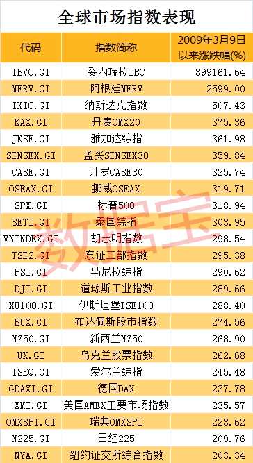 美股市場的表現(xiàn)驚艷全球。數(shù)據(jù)寶統(tǒng)計顯示,2009年3月9日以來,全球市場指數(shù)中,委內(nèi)瑞拉IBC、阿根廷MERV分別累計漲幅8992倍、26倍排名第1、第2位。