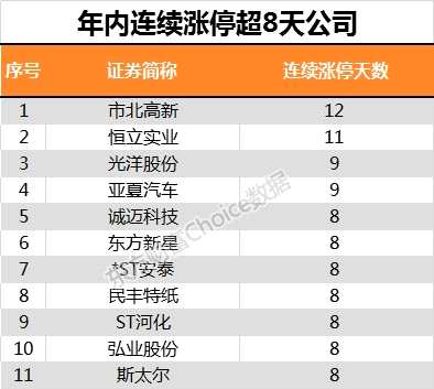 且市北高新和恒立實業(yè)也是年內(nèi)僅有的連續(xù)漲停超過10天的兩家公司,其次是光洋股份和亞夏汽車,連續(xù)漲停天數(shù)均為9天。