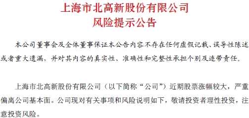 隨著監(jiān)管層的“點名”發(fā)聲,以及對“問題”股的監(jiān)管趨嚴,近來“作妖”的恒立實業(yè)、群興玩具以及ST概念都有“收手”的態(tài)勢,不過,卻有一只個股在“頂風作案”,他就是市北高新,繼前晚發(fā)布股票交易異常波動暨風險提示公告后,昨晚再次發(fā)布風險提示公告,表示近期股票漲幅較大,嚴重偏離公司基本面。