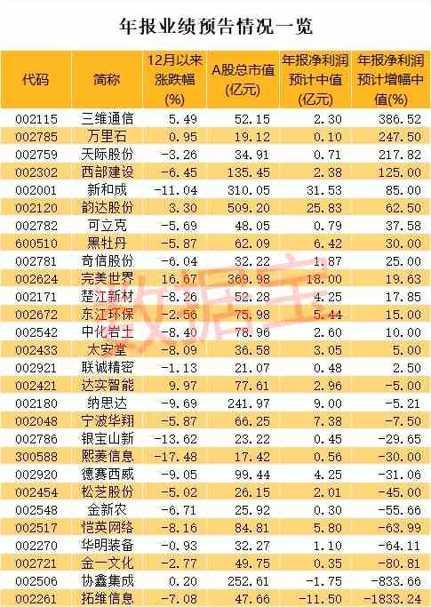 距離2018年結(jié)束不到10天時間,這些上市公司會交出怎樣的成績單?數(shù)據(jù)寶統(tǒng)計顯示,從已經(jīng)公布業(yè)績預(yù)告的情況看,三維通信、萬里石、天際股份、西部建設(shè)、新和成等股年度凈利潤預(yù)計增幅中值在50%以上。