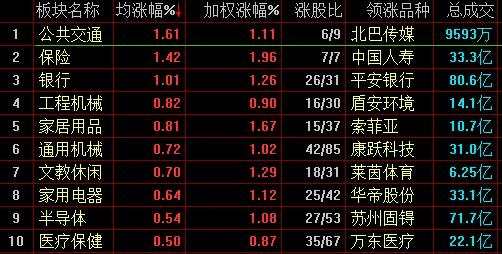 盤面上看,行業(yè)板塊漲跌情況基本持平,公共交通、保險(xiǎn)、銀行、工程機(jī)械、家居用品漲幅居前;船舶、通信設(shè)備、農(nóng)林牧漁、航空、多元金融跌幅居前。