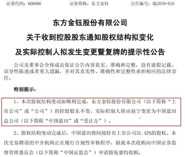 2月1日早間,東方金鈺發(fā)布全天停牌公告,當(dāng)日晚間,東方金鈺便發(fā)布了《收到控股股東通知股權(quán)結(jié)構(gòu)擬變化及實(shí)際控制人擬發(fā)生變更暨復(fù)牌的提示性公告》,公告中提到,本次股權(quán)結(jié)構(gòu)變動(dòng)如順利完成,東方金鈺的控股股東不變,實(shí)際控制人將由趙寧變更為中國(guó)藍(lán)田。股權(quán)結(jié)構(gòu)變動(dòng)完成后,中國(guó)藍(lán)田將間接持有上市公司31.42%的股權(quán)。