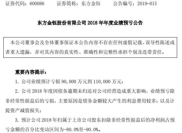 東方金鈺表示,公司 2018 年度因債務(wù)逾期未歸還對(duì)公司經(jīng)營(yíng)造成重大影響,業(yè)績(jī)預(yù)虧除非經(jīng)常性損益后的虧損,主要原因是債務(wù)金額較大產(chǎn)生的利息費(fèi)用較多;以及計(jì)提資產(chǎn)減值損失。