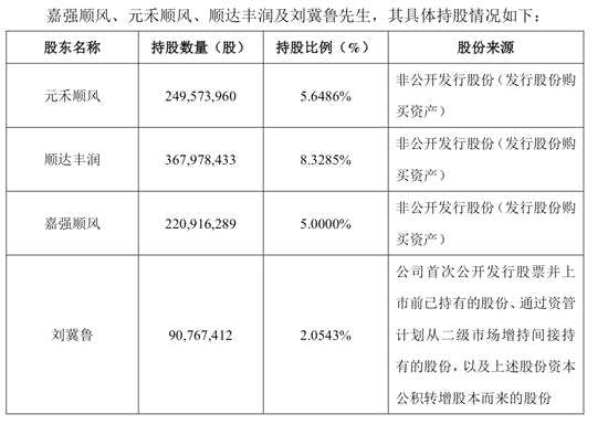公告顯示,目前元禾順風、順達豐潤、嘉強順風和劉冀魯分別持有順豐控股5.65%、8.33%、5%和2.054%股份。