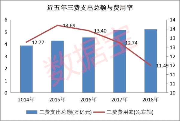 銷售費(fèi)用、管理費(fèi)用及財務(wù)費(fèi)用(以下統(tǒng)一簡稱“三費(fèi)”)作為上市公司內(nèi)耗的最主要部分,費(fèi)用支出與公司的營收能力掛鉤。數(shù)據(jù)寶統(tǒng)計顯示,2018年度,A股上市公司三費(fèi)支出合計5.21萬億元,創(chuàng)近五年來新高。相比之下,2018年度上市公司費(fèi)用率僅11.49%,創(chuàng)近五年來新低,并首次降至12個百分點(diǎn)以下。