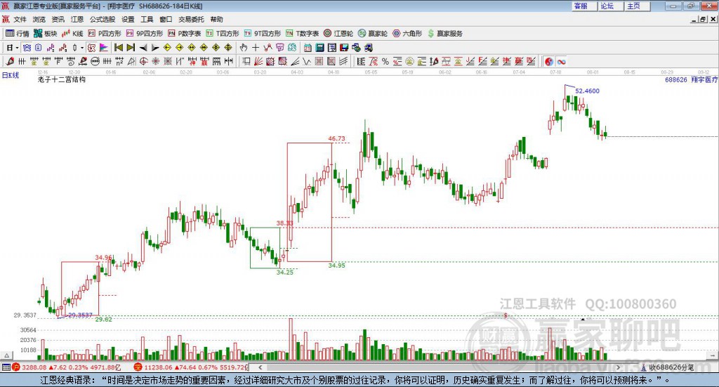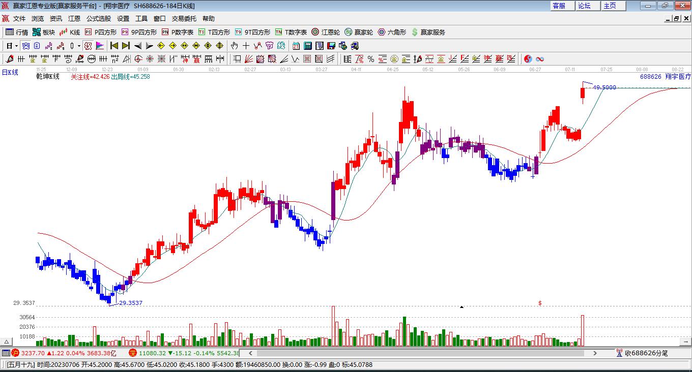 688626翔宇醫(yī)療漲至老子十二宮上漲結(jié)構(gòu)頂部上方區(qū)域附近 近29個(gè)交易日漲幅61.84%