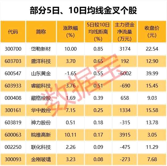 截至7月9日收盤,有15只A股的5日均線主動上穿10日均線,其中岱勒新材、盛洋科技、山東黃金等個股的5日均線較10日均線距離最大,分別達0.85%、0.65%、0.55%。